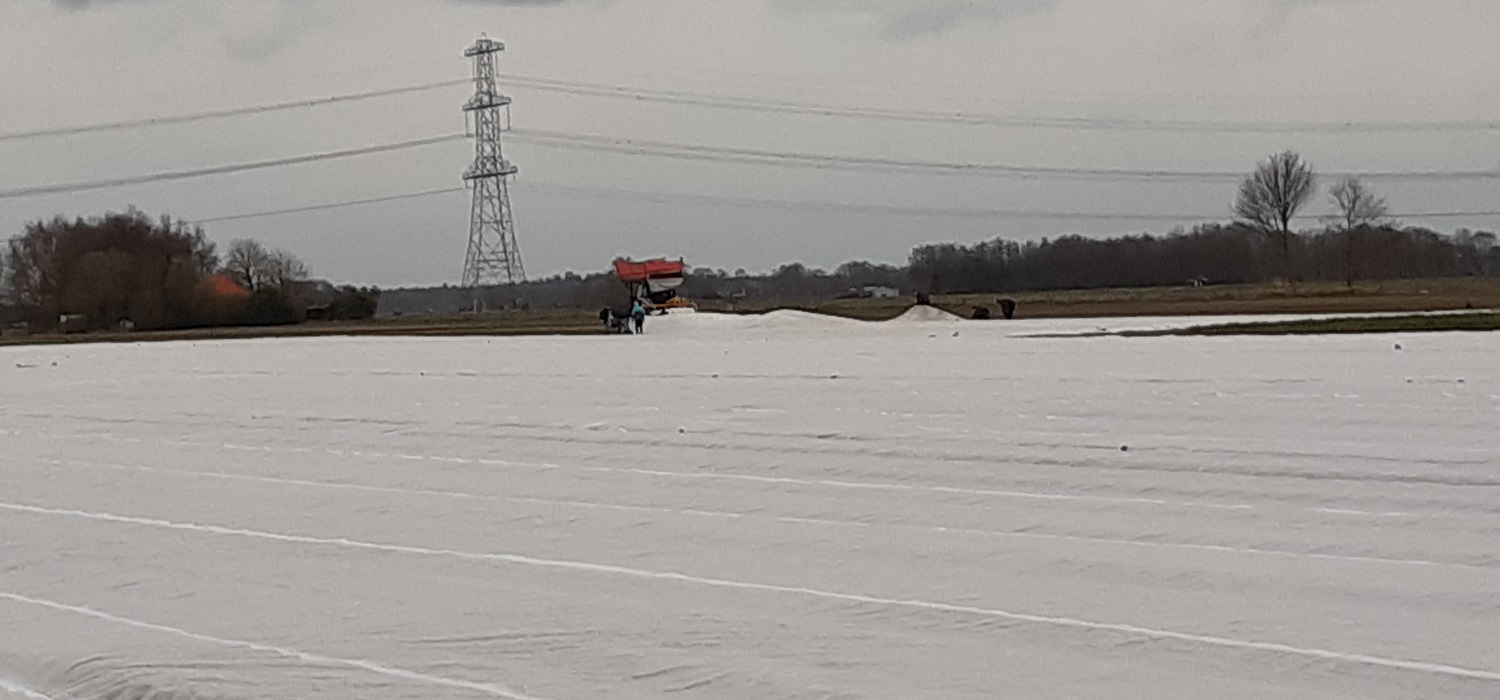 Verder hebben we op een perceel vliesdoek gelegd, heel dun doek dat het hele perceel bedekt. Een hele klus, zeker als de wind een beetje dwars ligt... Dit doek laten we liggen zolang de nachtvorsten aanhouden maar zodra het kan gaat het er direct weer af omdat het anders te warm wordt eronder. Dan rollen we het doek op haspels en laten we het bij het perceel liggen en kunnen we ze eventueel nogmaals gebruiken. Ook de grindzakken, waarmee het doek vast ligt, blijven gewoon tussen de rijen liggen en gaan pas opgeruimd worden als het doek echt niet meer gebruikt gaan worden dit seizoen.